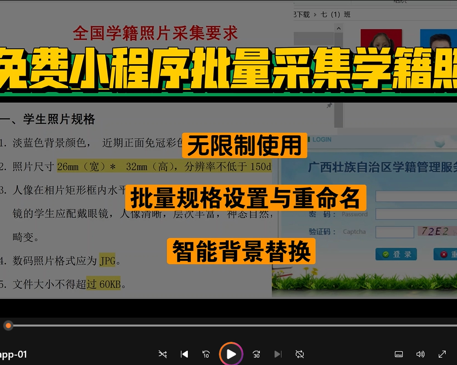 学籍拍照助手小程序适用于线上自助采集, 完全免费。批量设置照片大小、自动更换照片背景色、对学籍照片批量命名,教师通过小程序教师端设置好学籍照片规格和学生信息,学生在小程序学生端采集照片...
