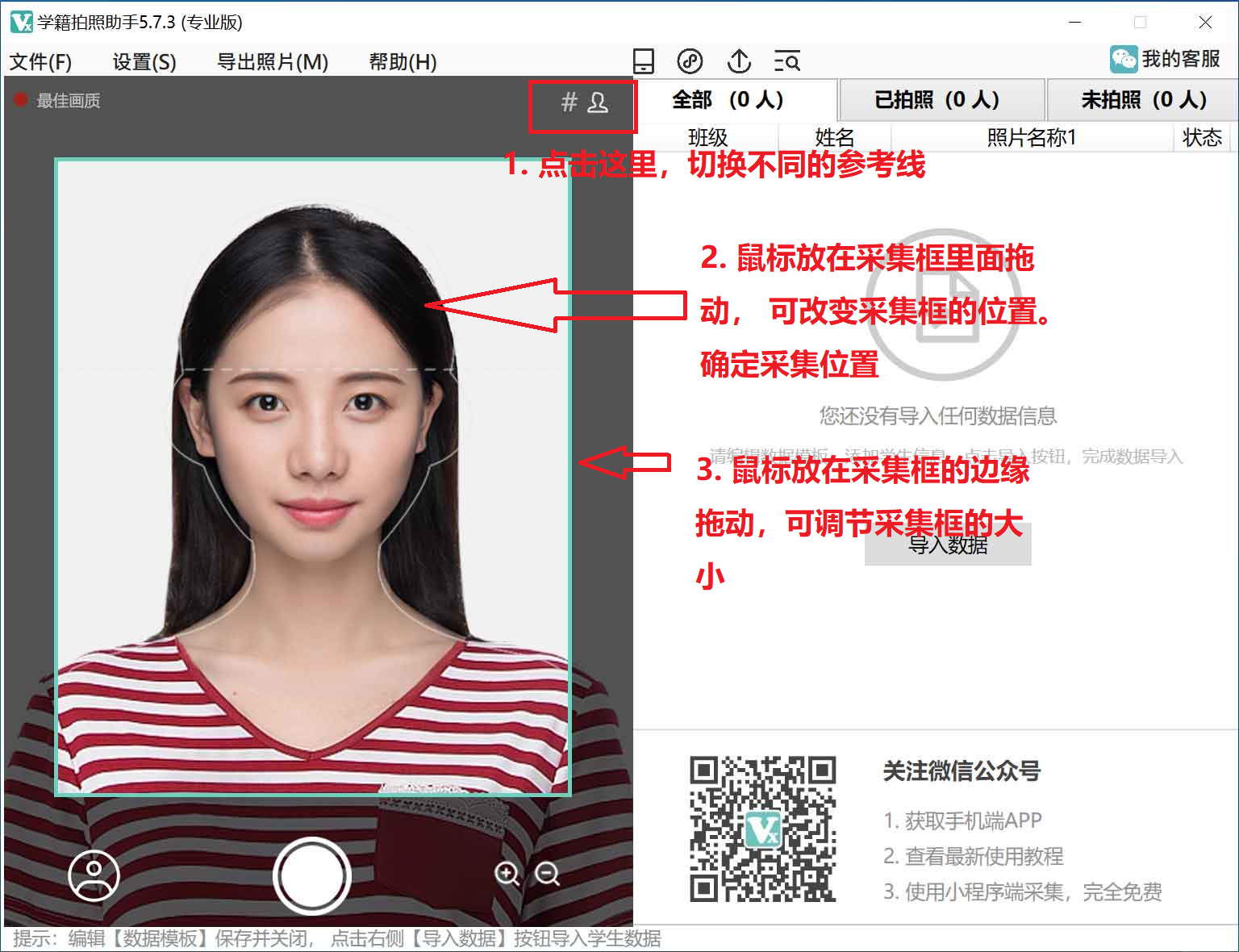 使用学籍拍照助手,可任意自定义照片名称,自定照片长宽、分辨率、文件大小等等规格。它适用于图像批量采集和批量自动命名的任何场景,例如学籍拍照、中考报名、计算机考试、社区人像采集、人脸识别等等。