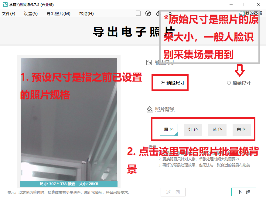 1) 采集完毕后,在菜单栏,选择“导出照片“ - ”电子照片“,弹出照片导出对话框, 选择“预设尺寸”(学籍拍照用), 并选择合适的背景色。点击下一步