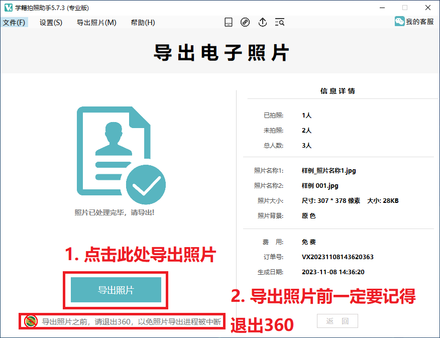1. 导出照片前一定记得退出360。 照片导出时,批量的照片复制行为可能会导致360误判,360会强行中断学籍拍照助手导出照片行为,导致导出的照片数量不全。 若用户导出照片时,未退出360,造成的后果由用户负责。