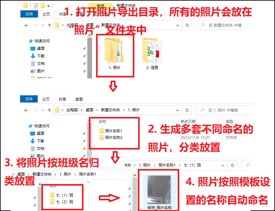 3) 学籍网要求有身份证号的学生,其照片文件以身份证号命名,并按年级、班级分文件夹存储。