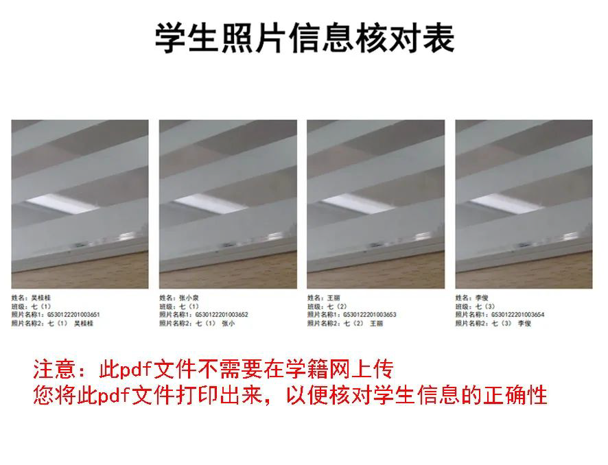 建议您将“学生照片信息核对表.pdf" 文件打印出来,然后由家长或学生本人对信息进行核对,以确保学生信息100%正确。
