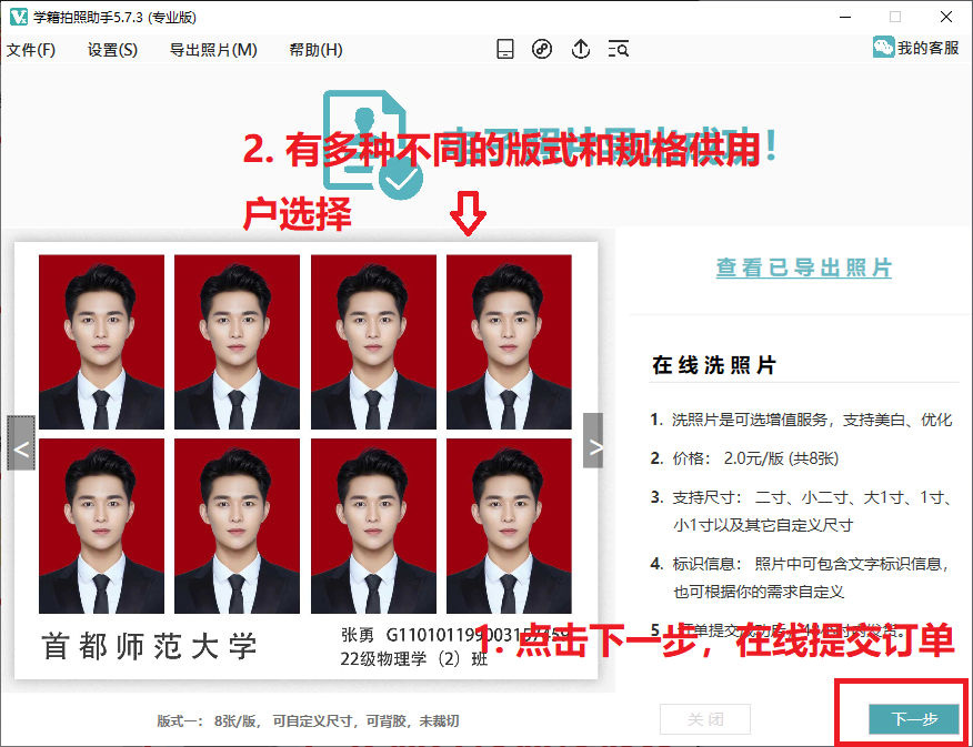 若用户需要纸质照片,可使用照片在线冲印服务。点击学籍拍照助手菜单栏,“导出照片” - “洗照片”,进入洗照片交互界面